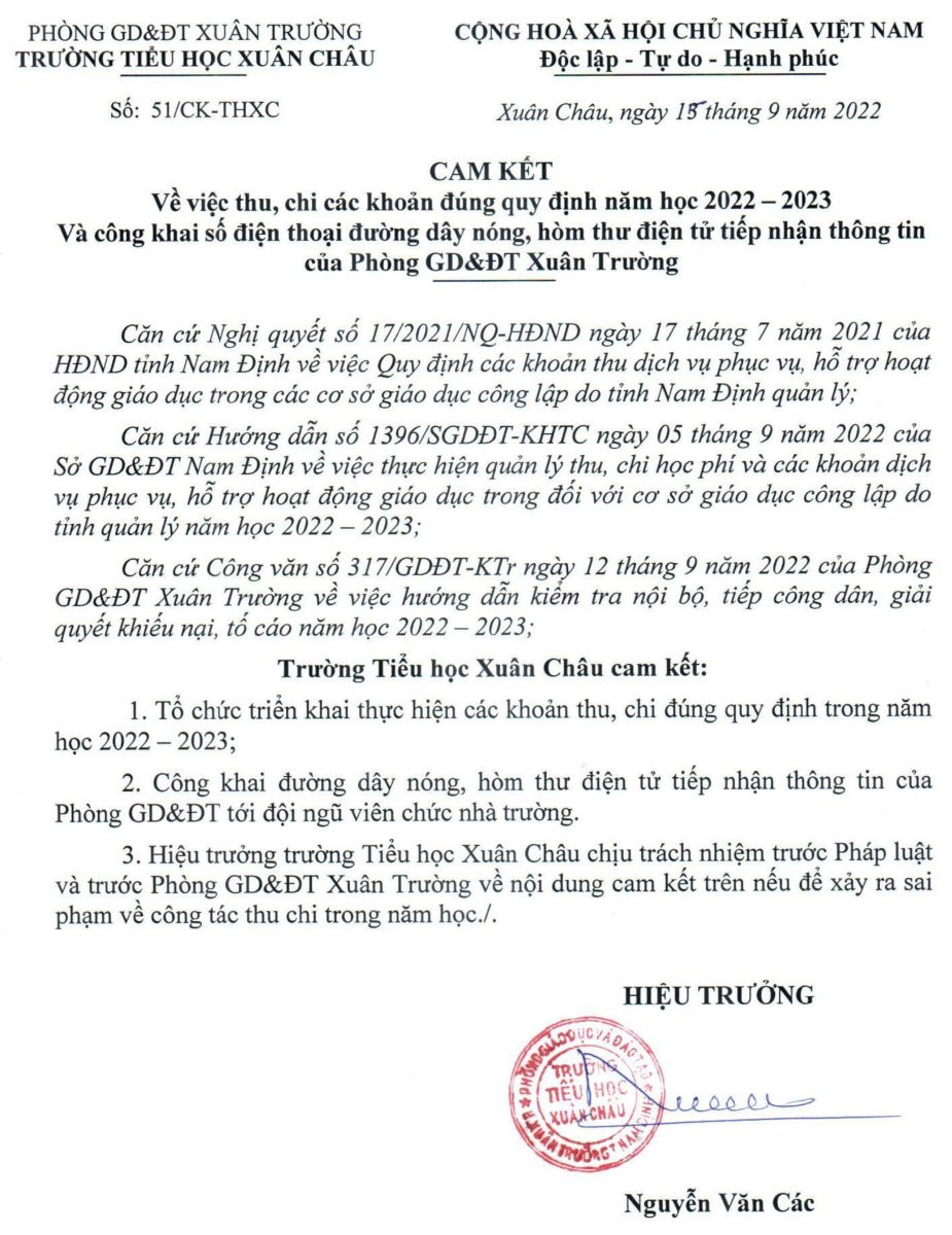 Cam kết về việc thu chi đúng theo quy định năm học 2022 – 2023 và công khai số điện thoại đường dây nóng, hòm thư điện tử tiếp nhận thông tin của Phòng Giáo dục – Đào tạo Xuân Trường